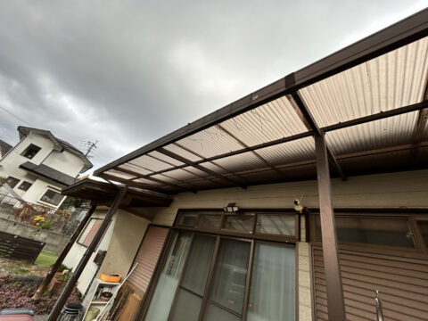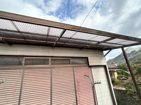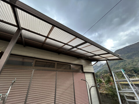 「波板にところどころ割れがあり、固定している金具も劣化して取れているので張り替えてほしい」というご依頼です。