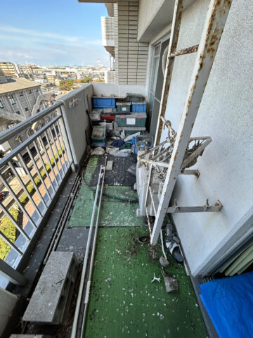「ベランダの鳩の糞を綺麗にしてほしい。その他の荷物も全部処分して、シートも剥がして綺麗にしてほしい」というご依頼です。