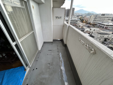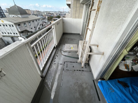 不用品をすべて撤去し、下のシートも剥がして、高圧洗浄機でベランダ全体を綺麗に清掃しました。